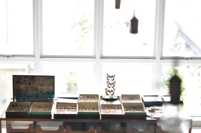 奥のカウンターは古いテーラーのシャツケースだろうか?そこには昆虫標本が並べられている。